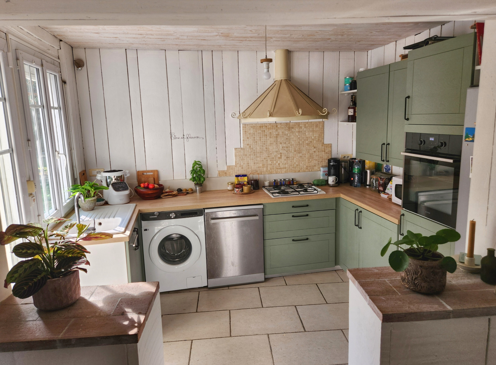 Dès l'entrée de 9,95 m², vous apprécierez l'agencement pensé pour la vie quotidienne. La salle à manger de 20,69 m² invite aux repas en famille, tandis que la cuisine aménagée de 9,57 m² avec ses éléments en bois peint apporte charme et authenticité. Parfaitement équipée avec hotte, plaque de cuisson quatre feux au gaz de ville et four intégré, elle répond à tous vos besoins culinaires.