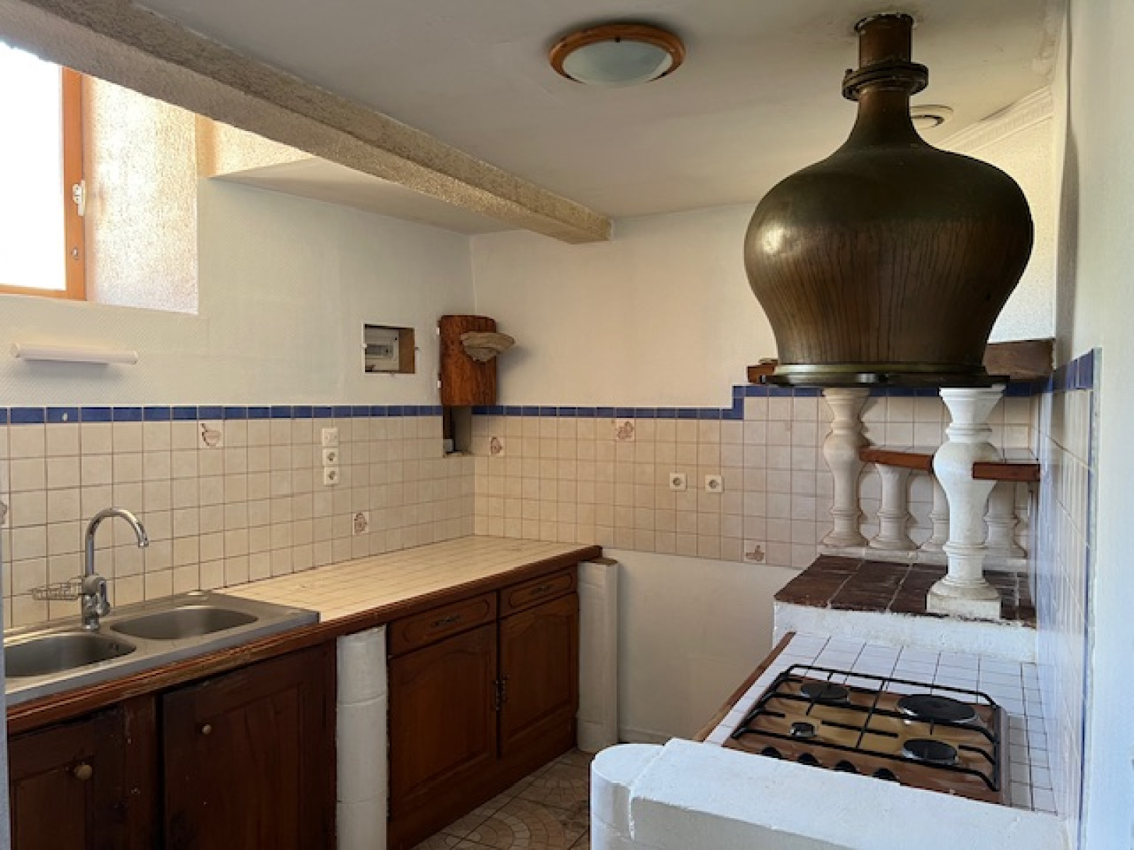 Un couloir de 2,78 m² (sol carrelé) mène à un bureau de 6,50 m², un WC indépendant avec lave-mains, ainsi qu’à une cuisine de 8,76 m² aménagée avec des éléments en bois et partiellement équipée d’une hotte et d’une plaque de cuisson quatre feux au gaz.